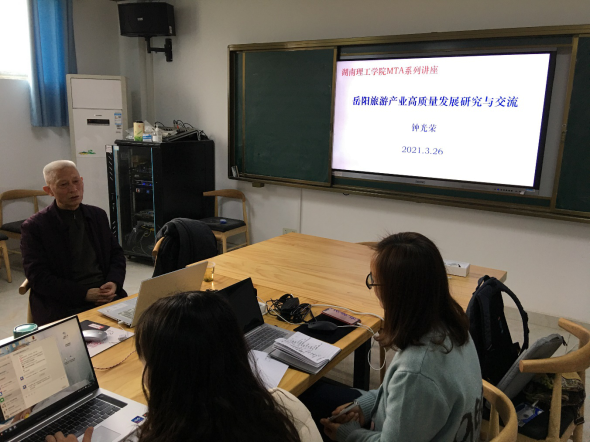 钟光荣先生作为一名长期从事经济实践和经济哲学理论研究的独立经济学者,曾发表论文50多篇,出版原创经济哲学理论著作8部14卷,400多万字,创建了自然本体价值论和自然经济哲学理论。会上,他向同学们全面讲解了岳阳旅游资源的基本分布、岳阳旅游产业发展中的主要问题、岳阳旅游产业发展的根本办法及岳阳城市发展的空间规划。他指出:岳阳旅游产业发展的主要问题,一是和外地旅游业相比,特别是和旅游大市强市相比,我们的比较优势发挥不够,绝对优势没有发掘;二是现有旅游景点和景区利用不足,旅游规划线路不够科学和不够合理;三是旅游边际效应递减加速,年轻人对岳阳景区心理欲求越来越低;四是随着旅游大省、大市、大景区的强势崛起,游客纷纷涌入的“马太效应”,会使我市的旅游产业产生“多米诺”效应;五是岳阳相关政府部门没有出台岳阳市旅游宏观发展规划与对策,不利于岳阳旅游产业的有序快速发展。针对岳阳旅游产业的主要问题他从不同维度的八个方面提出了解决的办法,他强调要发展与岳阳中国区域性大城市和省域副中心城市建设本匹配的全域大旅游产业,应充分发挥现有历史文化旅游项目优势,加快开发潜在旅游景点景区和旅游线路,尽快形成历史文化名城名牌旅游大效应;充分利用岳阳市独特的大江大湖,大山大平原的优势,加速发展山水田园风光游;充分开发地方特色的农、工、文产品,挖掘乡村特色旅游;政府要加快制定全市大旅游发展宏观规划,确定分期实施目标,分区分级分工明确工作内容。