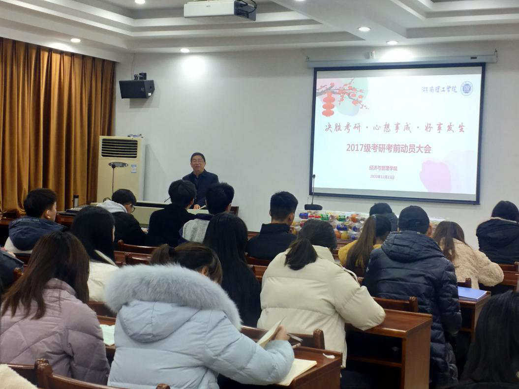 2017级考研考前动员大会分两场举行,下午4:00,2017级国际经济贸易、人力资源管理、旅游管理、电子商务、金融工程、工商管理6个本科专业的100余名同学参加,公司党委副书记刘敬龙,2017级辅导员顾绍春,毕业班级班主任陈望雄、何叶、徐明老师亲切到会与备考生座谈交流研考注意事项,为迎考加油鼓舞。